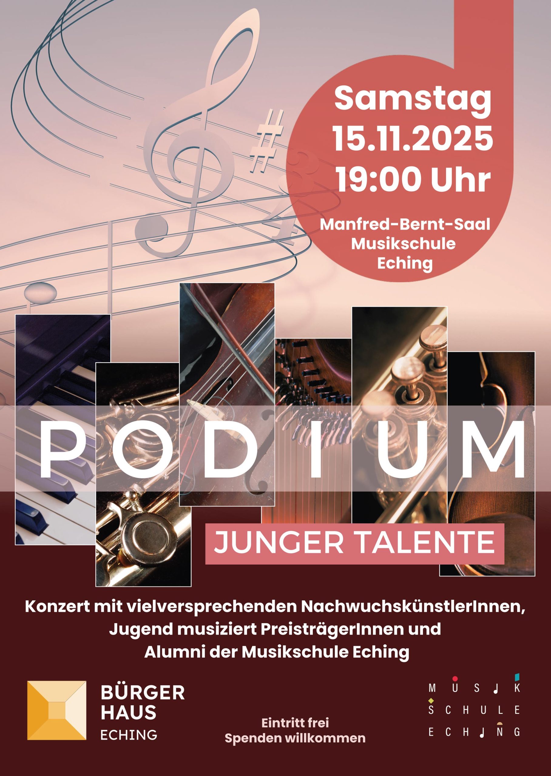 Nachdem das Konzert im Frühjahr krankheitsbedingt ausfallen musste, findet es jetzt am 15.11. um 19 Uhr im Manfred-Bernt-Saal der Musikschule Eching statt. Im Rahmen des Podiums junger Talente präsentieren vielversprechende NachwuchskünstlerInnen, die mit Leidenschaft und Hingabe ihre Musikstücke darbieten, ihr außergewöhnliches Talent. Viele der jungen Musiker sind mehrfache Preisträger des renommierten Wettbewerbs “Jugend musiziert” und erzielten in den letzten Jahren herausragende Leistungen. Das Konzert bietet einen Einblick in die musikalische Vielfalt der Musikschule Eching mit ehemaligen und aktuellen SchülerInnen und ist ein Highlight für Musikliebhaber und Unterstützer der jungen KünstlerInnen. Lassen Sie sich von dem hohen Niveau beeindrucken und begeistern!